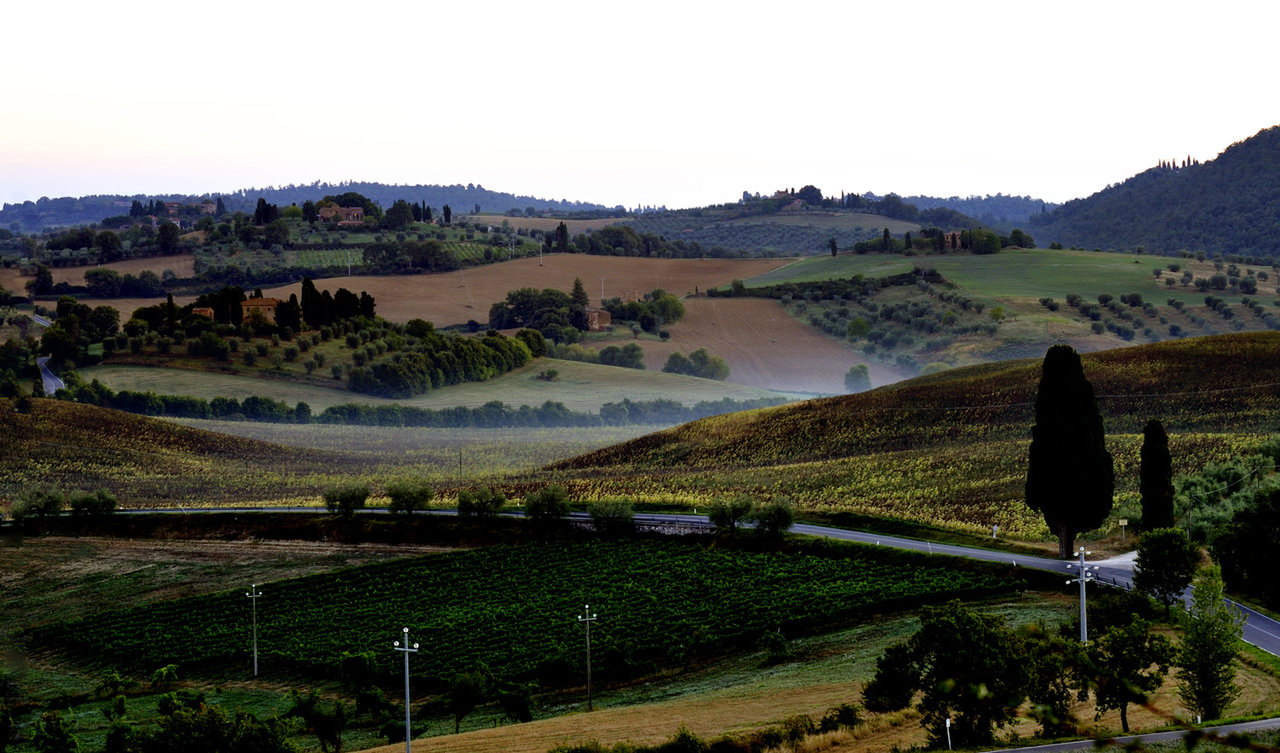 The Val d’Orcia, or Valdorcia, is a region of Tuscany, central Italy, which extends from the hills south of Siena to Monte Amiata. It is characterised by gentle, carefully cultivated hills occasionally broken by gullies and by picturesque towns and villages such as Pienza(rebuilt as an “ideal town” in the 15th century under the patronage of Pope Pius II), Radicofani (home to the notorious brigand-hero Ghino di Tacco) and Montalcino (the Brunello di Montalcino is counted among the most prestigious of Italian wines). It is a landscape which has become familiar through its depiction in works of art from the Renaissance painting to the modern photograph.
